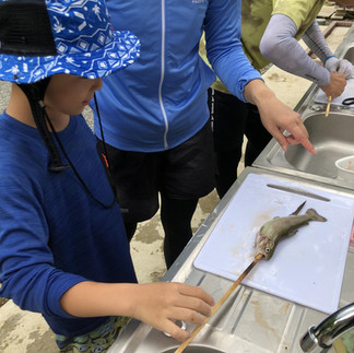リバーベースに戻り、子供達は自分が釣った魚をさばく体験。